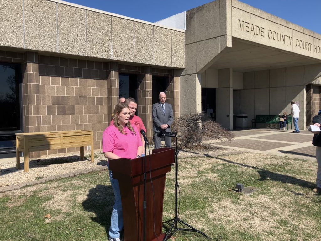 Shelbi Saylor, daughter of Rhonda Aebersold, speaks to the media during a press conference regarding the homicide investigation into her mother’s death at the Meade County Courthouse Friday.