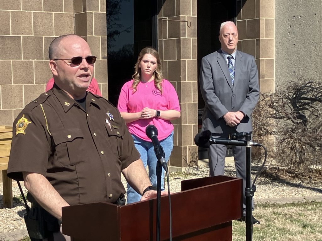 Meade County Sheriff Phillip Wimpee speaks during Friday’s press conference regarding the Rhonda Aebersold homicide investigation. Aebersold’s daughter Shelbi Saylor and Detective Danny Knell stand in the background.