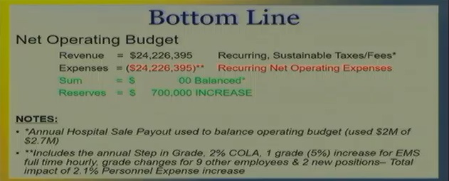 “You can see that the revenue is $24 million-plus, with expenses exactly the same, and we end up of course with a balanced budget, and also considering the hospital sale payout as revenue, then we will end up with $700,000 that will go to increase the reserves,” Taul said.
